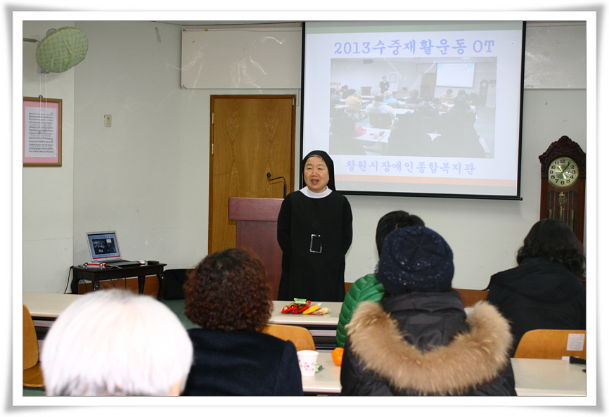 아드미에요~~~^^ <?xml:namespace prefix = o ns = "urn:schemas-microsoft-com:office:office" />저희 복지관 체육재활팀에서 제안한 "지역사회 수중재활운동 전문요원 양성 및 프로그램 보급사업" 프로그램이 경남사회복지공동모금회에 선정되어 배분금전달식에 이정일 관장수녀님께서 참여하고 왔어요...