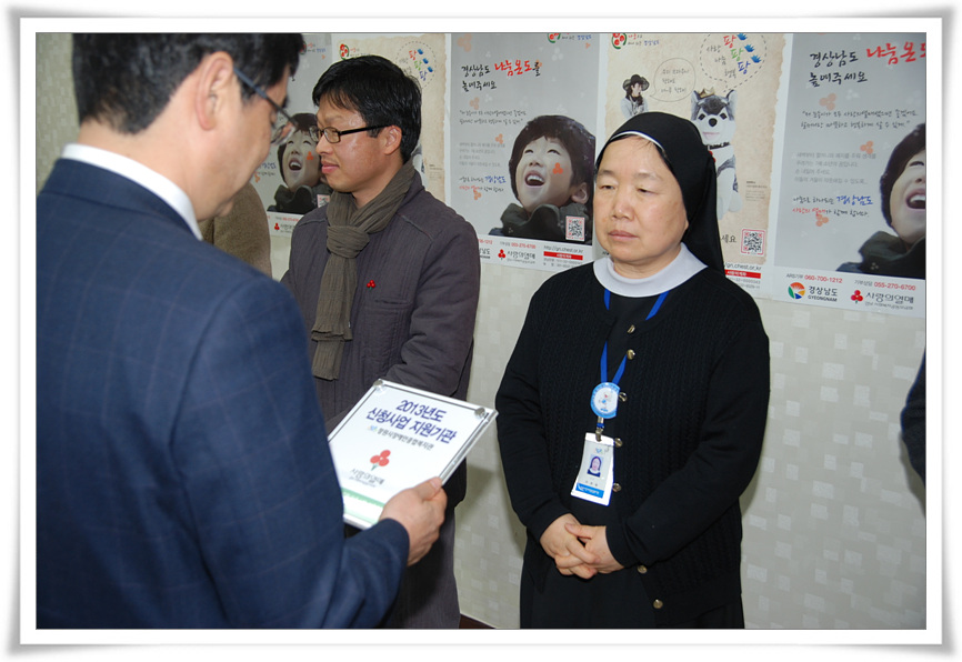 저희 복지관 체육재활팀에서 제안한 "지역사회 수중재활운동 전문요원 양성 및 프로그램 보급사업" 프로그램이 경남사회복지공동모금회에 선정되어 배분금전달식에 이정일 관장수녀님께서 참여하고 왔어요.