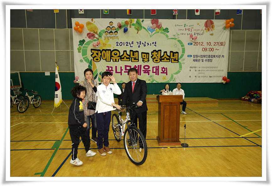 특히 이번 꿈나무체육대회를 위해 한국마사회창원지점에서 일금삼백만원(₩3,000,000)을, 킹바이크에서 자건거 3대를 지원해 주셨어요. 그래서 경품을 통해 푸짐한 상품과 자전거를 드릴 수 있었어요.