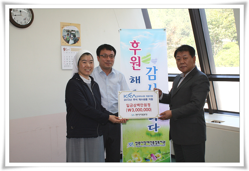2012. 9. 20(목), 오늘 한국마사회창원지점 추석 제수용품 지원금 삼백만원(₩3,000,000)을 후원금 전달식이 있었어요.