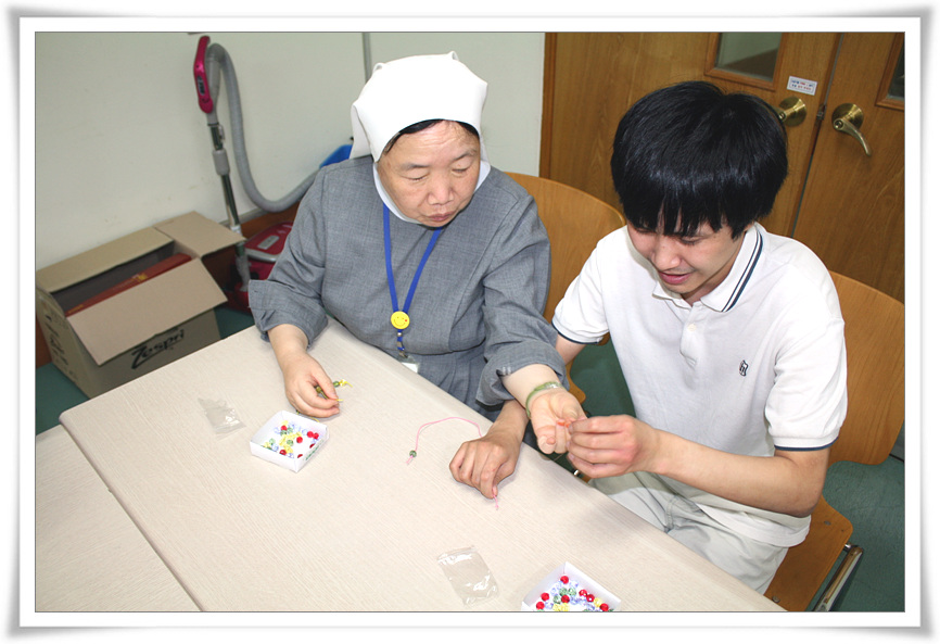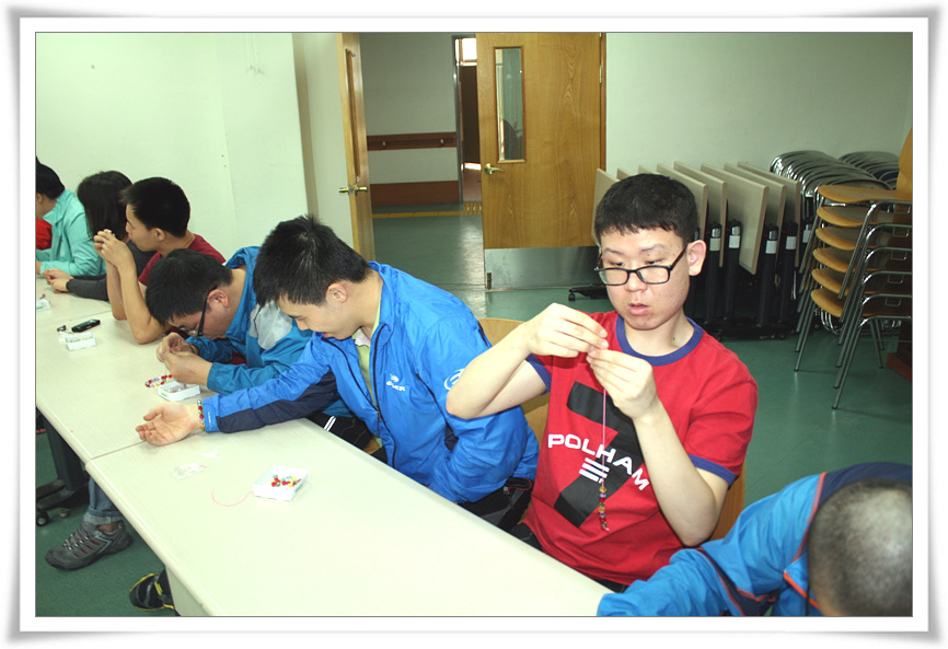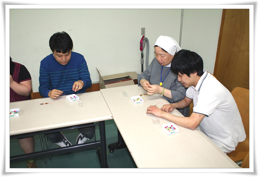 9.27(목), 오늘은 보호작업장 훈련생들의 특별활동으로 『자신의 혈액형별 DNA팔찌만들기』수업이 진행되었어요.
