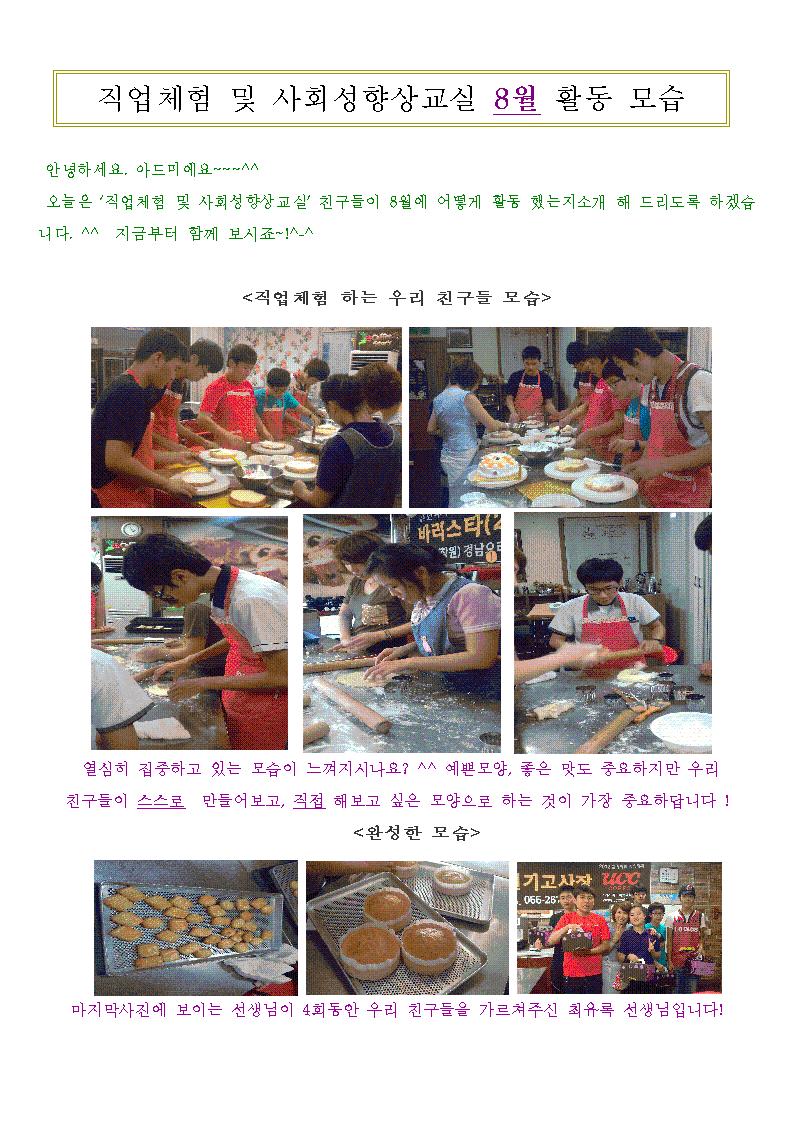 아드미에요~~^^ <?xml:namespace prefix = o ns = "urn:schemas-microsoft-com:office:office" />직업체험 및 사회성향상 교실이 시작되어 우리 친구들과 함께 즐거운 시간들을 보내고 있는데요, 2주동안 어떠한 체험들을 했는지 한번 보도록 해요 ^^ 8월달은 직업체험으로 제과제빵사 체험을 ...
