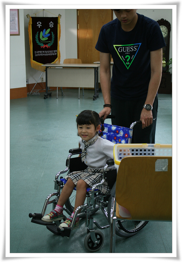 처음엔 유아용 휠체어를 타는 게 신기한 놀이쯤 생각을 하는 모습이었는데 체험을 다 마치고서는 소중한 장애인친구들에게 함께 사랑하기로 하였답니다.