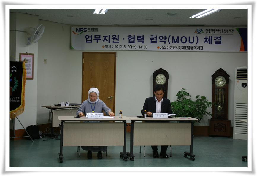 국민연금공단창원지사(지사장 안향문)와 저희 복지관의 업무지원·협력 협약(MOU)체결식 8월 29일 복지관 강당에서 있었어요.