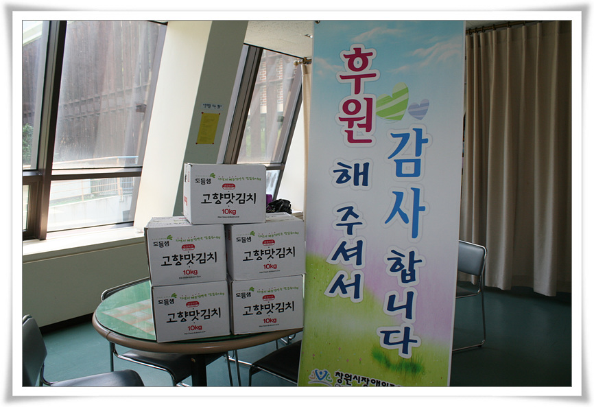 (주)한길유통 윤종배 사장님께서는 매월 포기김치 10kg 5박스(총50kg)를 재가장애인 밑반찬지원사업에 사용하도록 후원해 주기로 약속하셨어요. 너무 감사한 일이라 사진으로 찍어 알려드릴라 했더니 극구 사양하시네요^^
