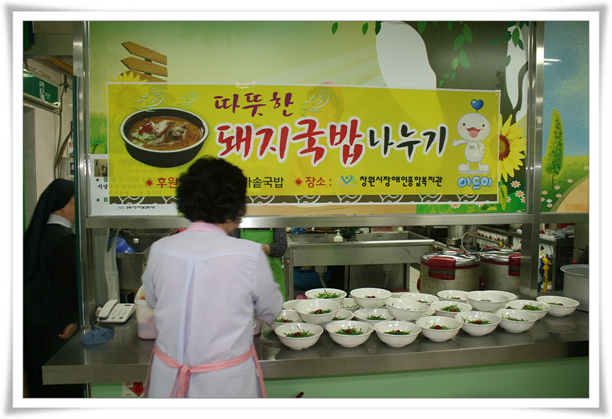 평생 국밥하나로 창원지역에서 자수성가하신 “합천할매가마솥국밥” 조순자할머니께서 남은 여생을 봉사활동에 힘쓰고 싶다고 하시며, 복지관을 이용하는 장애인과 가족, 직원 등 100여명에게 할머니께서 직접 우려낸 국밥을 제공해 주셨어요.