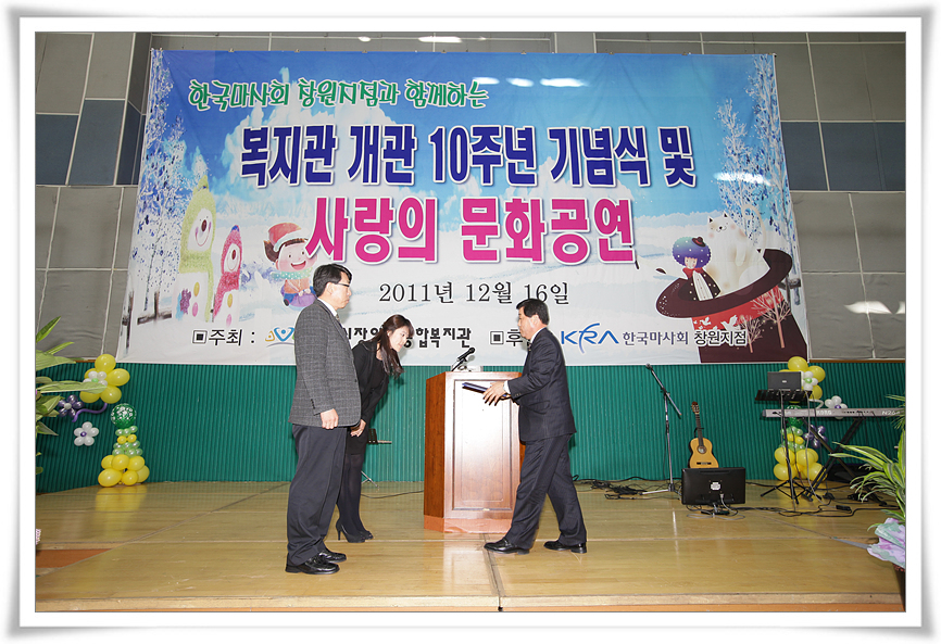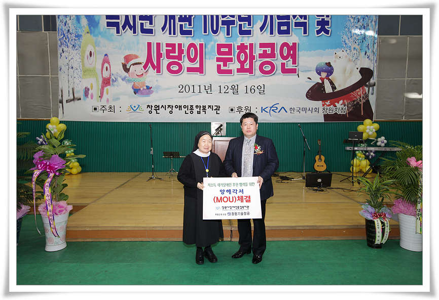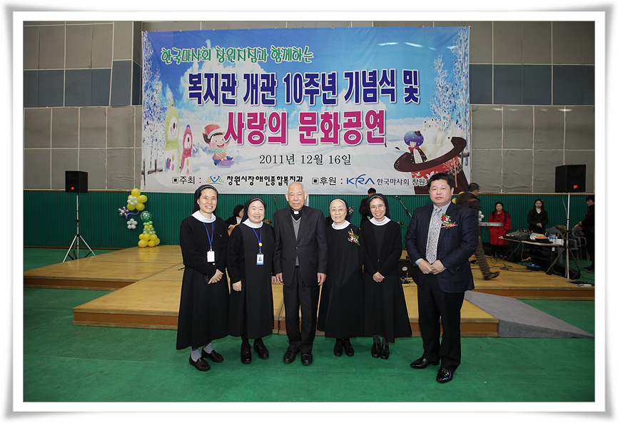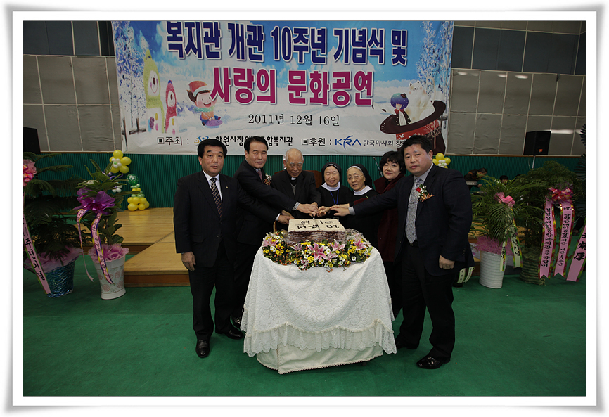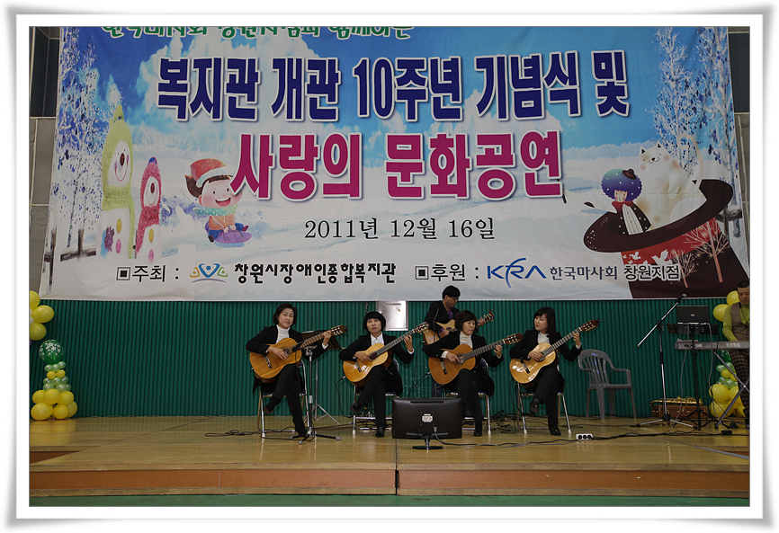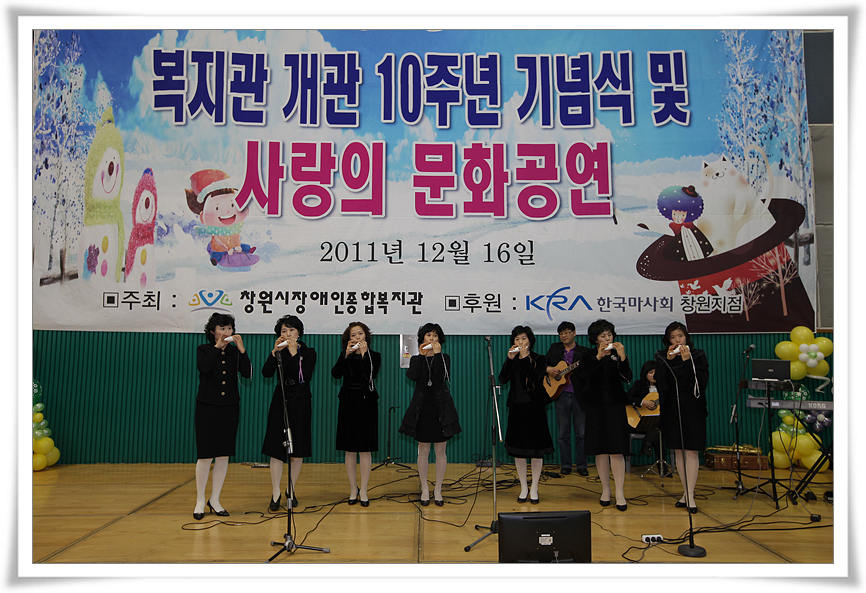 이에 복지관을 이용하시는 분들께 감사하는 마음을 전하고자 2011년 12월 16일(금) 개관 10주년 기념행사를 마련하여 500여명의 지역 장애인을 비롯한 지역주민들의 참여로 성대하게 치러졌습니다.