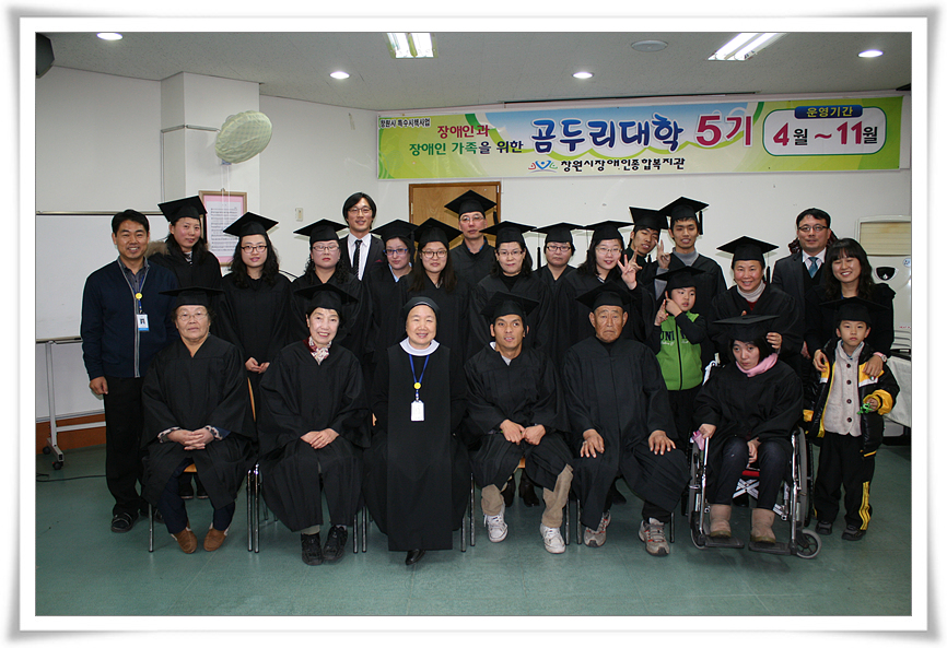 곰두리대학 제5기 졸업식 2011. 12. 8(목), 곰두리대학 제5기 졸업식에 많은 분들의 참석으로 성황리에 마쳤습니다. 1년동안 열정적으로 교육에 참여하신 30명 교육생들의 아름다운 졸업식이었습니다.