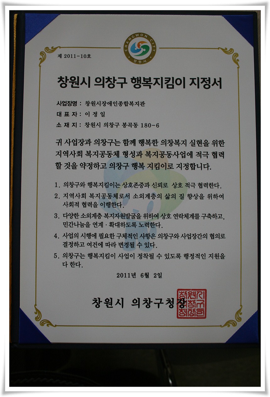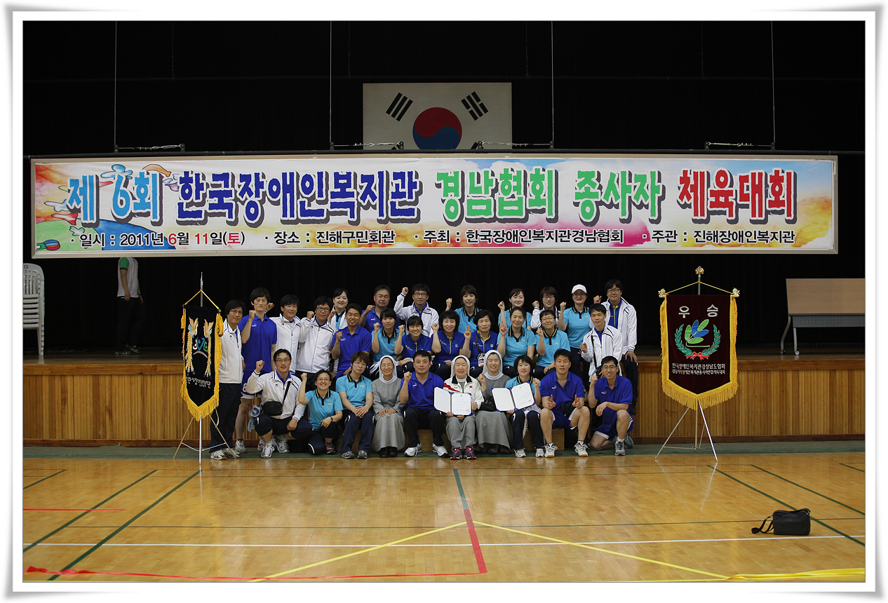 2011년 6월 11일, 제6회 경남지역장애인복지관 종사자 체육대회에 참가하여 당당히 전종목 우승, 종합우승을 차지하였습니다. 남들은 당연한 우승이라 생각할지 모르겠지만 그동안 체육대회 우승을 위해 많은 연습을 했었습니다. 힘든 과정의 결과로서 당당한 우승기를 가져 올 수 있었습니다. 무엇이든지 도전하는 복지관, 최고의 복지관을 만들기 위해 우리 모두...
