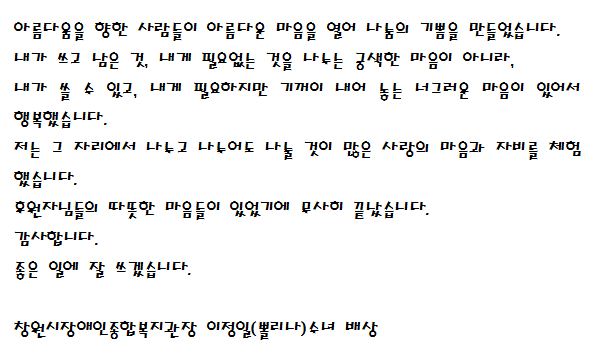 지난 5월 26일(목) 재가장애인분들을 모시고 장애인테마여행으로 울산 간절곶과 장생포 고래박물관을 다녀왔습니다. 비가 많이 왔는데도 즐겁게 다녀온 하루였습니다. 도움을 주신 적십자 봉사회에 감사드리며, 편안하고 즐거운 여행이 되도록 후원해 주신 한국마사회창원지점장 및 관계자 여러분께 감사의 인사를 드립니다.