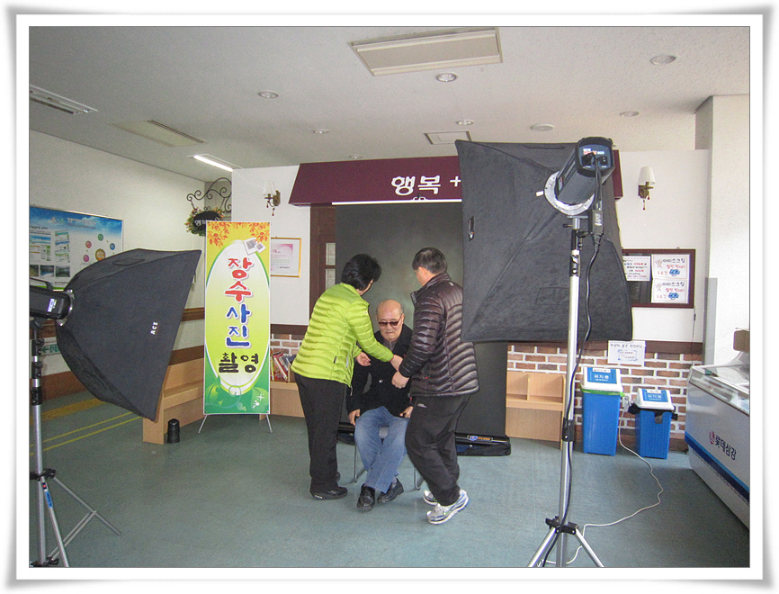 이날 장수사진 촬영은 진해해군사령부 김해국 군무주사님께서 사진을 찍어 주셨으며, 복지관 어르신 모두는 사랑이 듬뿍 담긴 사진을 받아 가시게 되었습니다.