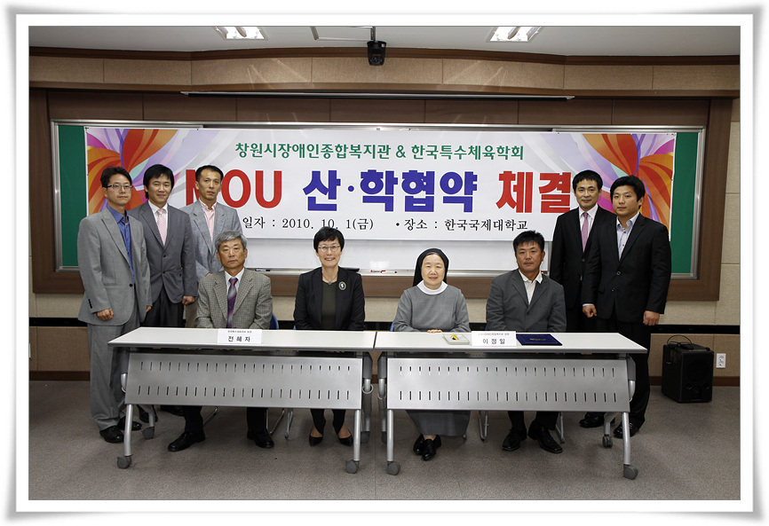 한국특수체육학회(학회장 전혜자)와 창원시장애인종합복지관 MOU체결식이2010. 10.1(금) 한국국제대학교에서 한국국제대학교 특수체육교육과 이철환교수외내빈이 참석한 가운데 거행되었습니다. [ MOU체결 내용] 창원시장애인종합복지관과 한국특수체육학회(이하“양 기관”이라 한다)는 산․학협력의 취지에 입각하여 양 기관의 상호유대를 강화하고, 인적자원육성 및 학술...