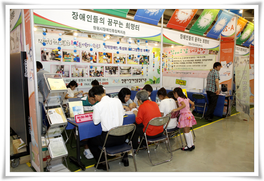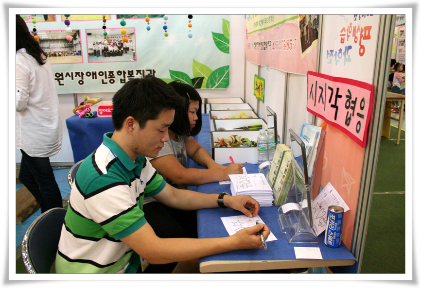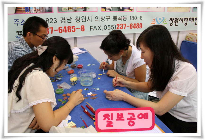 여성장애인기능습득교육의 일환으로 진행된 칠보공예체험, 장애인스포츠경기 휠체어탁구체험, 장애오감체험, 시각장애인 점자체험, 그리고 복지관 사업홍보 등을 준비하여 행사장을 찾은 많은 관람객들의 관심을 모았습니다.