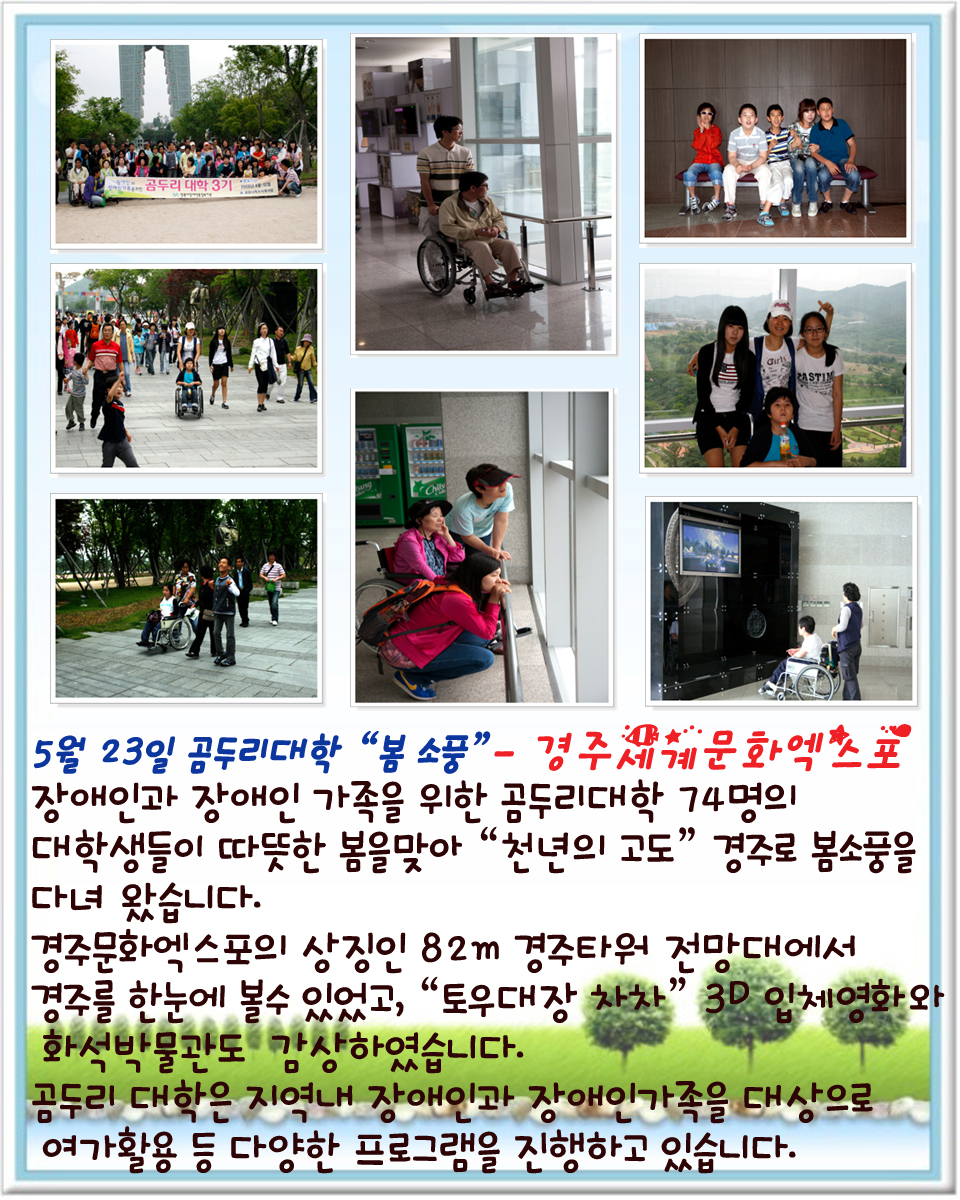 곰두리 대학 봄소풍 페이지 정보 작성자 운영자 댓글 0건 조회 8,219회 작성일 09-05-28 11:36 본문 . 이전글창원중앙라이온스클럽 회장 이취임식 09.06.01 다음글제4회 경남지역장애인복지관 종사자 체육대회 09.05.19 목록 댓글목록 댓글목록 등록된 댓글이 없습니다.