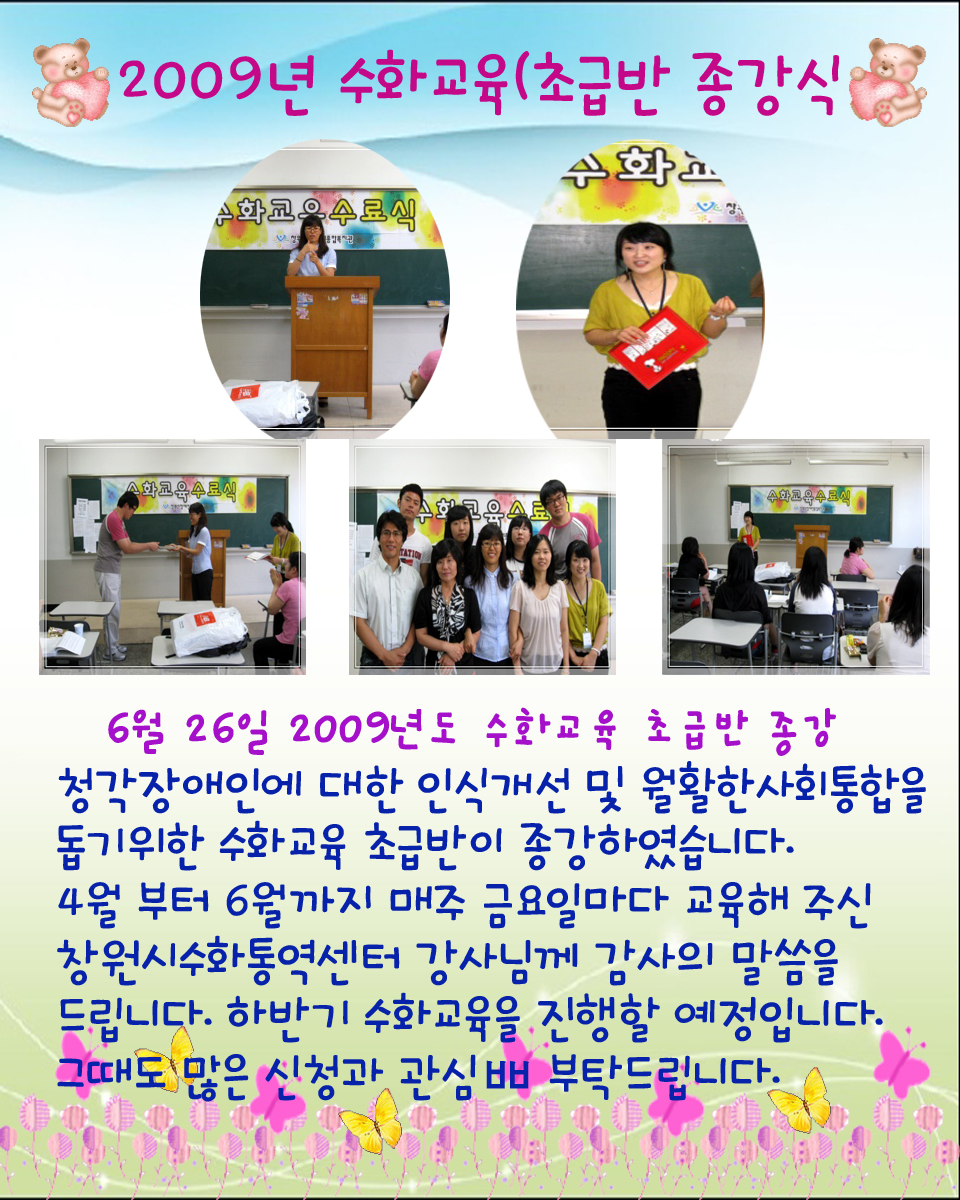 2009년도 수화교육식 종강 페이지 정보 작성자 운영자 댓글 0건 조회 8,325회 작성일 09-06-29 13:07 본문 . 이전글2009년 상반기 활동보조인 간담회 09.07.07 다음글복지관 후원해주신분들 09.06.26 목록 댓글목록 댓글목록 등록된 댓글이 없습니다.