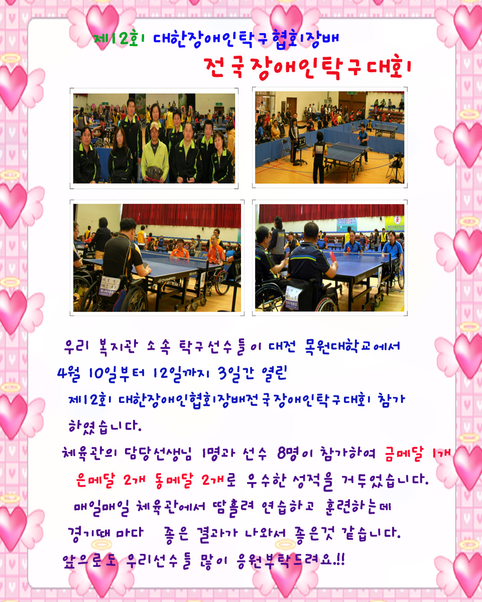 제12회 대한장애인탁구협회장배 전국장애인탁구대회 페이지 정보 작성자 운영자 댓글 0건 조회 8,506회 작성일 09-04-14 19:17 본문 . 이전글곰두리대학 3기 새봄맞이 토피어리 만들기 09.04.16 다음글창원 온천초등학교 장애이해교육 및 장애체험교육 09.04.14 목록 댓글목록 댓글목록 등록된 댓글이 없습니다.