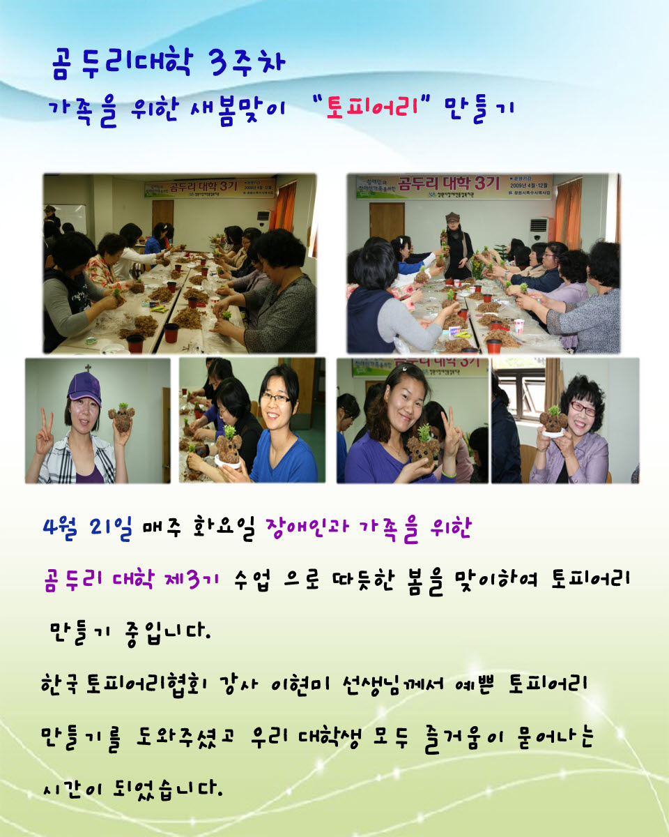 곰두리대학 3기 새봄맞이 토피어리 만들기 페이지 정보 작성자 운영자 댓글 0건 조회 8,166회 작성일 09-04-16 11:31 본문 . 이전글4월 성인여가활동프로그램 09.04.20 다음글제12회 대한장애인탁구협회장배 전국장애인탁구대회 09.04.14 목록 댓글목록 댓글목록 등록된 댓글이 없습니다.