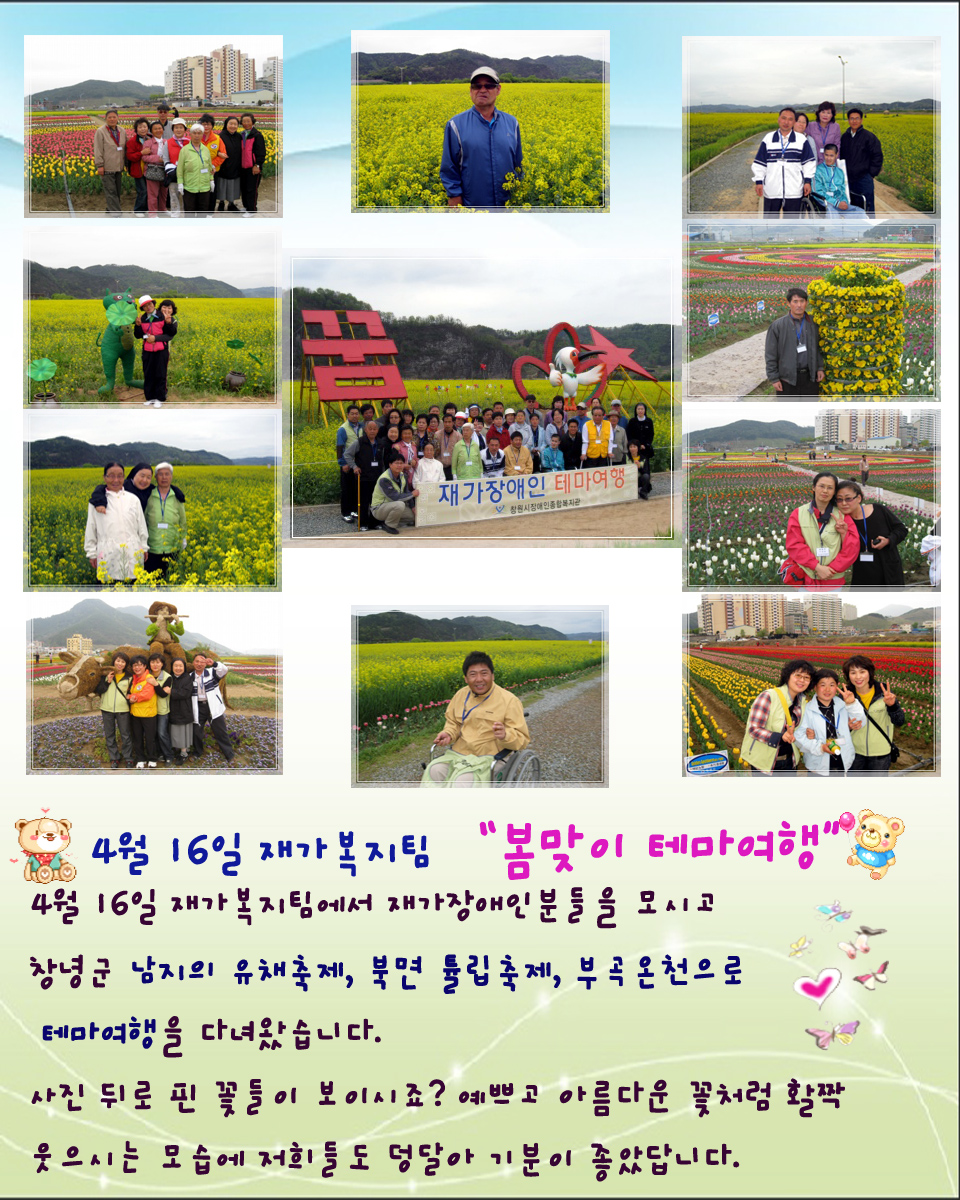 재가복지팀 봄맞이 테마여행 페이지 정보 작성자 운영자 댓글 0건 조회 8,335회 작성일 09-04-21 10:18 본문 . 이전글제29회 장애인의 날 기념식 09.04.23 다음글4월 성인여가활동프로그램 09.04.20 목록 댓글목록 댓글목록 등록된 댓글이 없습니다.