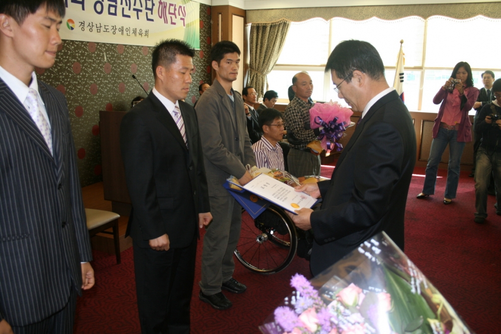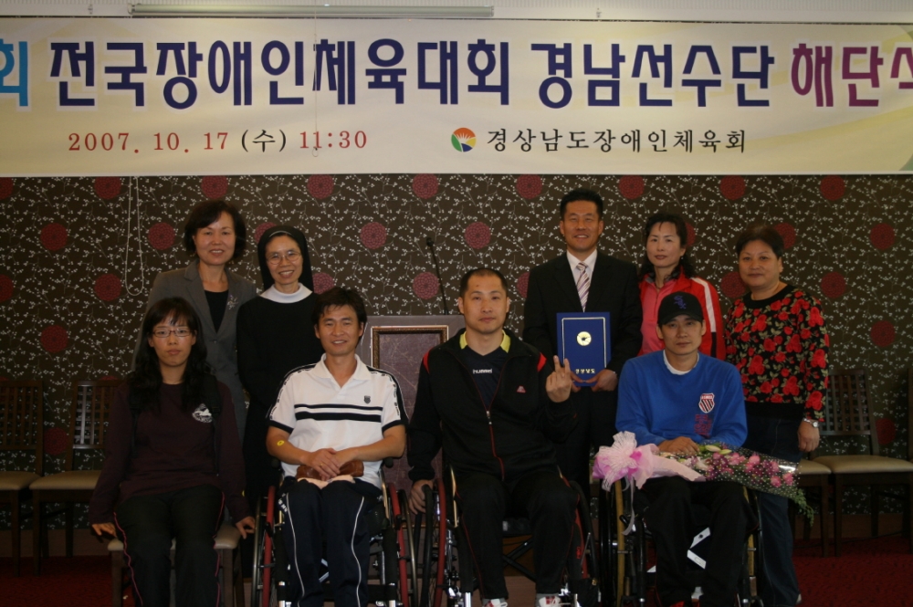 10월 17일 제 27회 전국장애인체육대회 경남선수단 해단식에서 우리 복지관 김우진 선생님께서 도지사표창장을 수여 받았습니다.<br />
