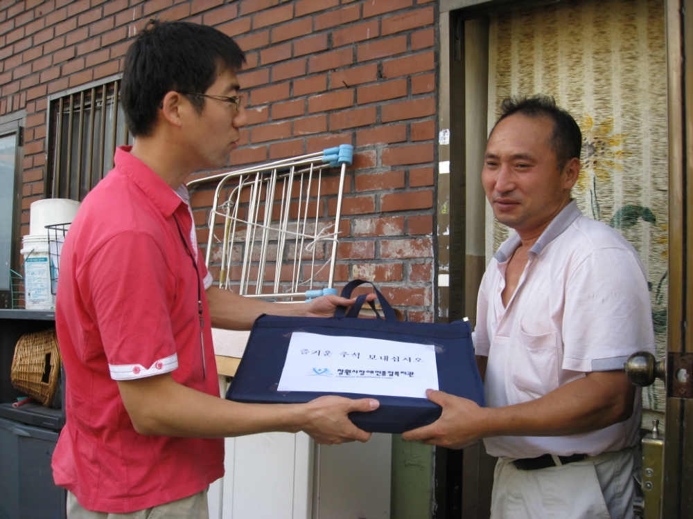 추석연휴 전 가정환경이 어려운 재가장애인들에게 추석을 맞아 선물과 한국도로공사 창원지사에서 지원해준 쌀을 전달했습니다.<br />