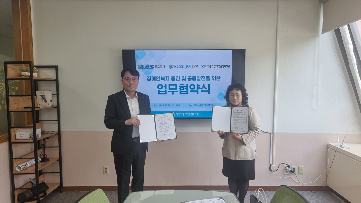 지난 4월 12일(금) 창원시장애인종합복지관(관장 송호도), 경남대학교 간호학과(학과장 양승경), 경남대학교 링크3.0 사업단(단장 박은주)은 상호협력을 통한 장애인 의료∙복지서비스 질 향상과 지역사회 네트워크 구축을 위한 업무협약을 체결하였습니다. 이번 협약을 통해 전문 인력 양성 및 역량 강화, 맞춤형 복지 프로그램 개발, 지역사회 장애인 의료∙복지네...