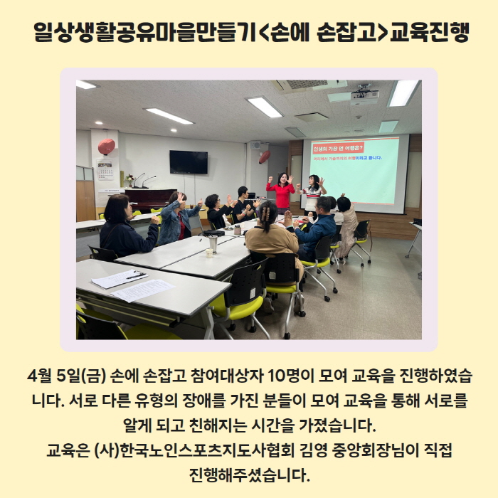 우리복지관 사회서비스팀에서는 3월 4일(월) 보수교육 진행으로 부정수급예방교육을 진행하였습니다. 이번 교육은 경상남도 장애인종합복지관 정유성 대리의 강의로 활동지원제도와 근로법령관계, 부정수급의 사례중점 등으로 진행되었습니다.강의 요청에 응해주신 정유성 대리님과 활동시간 중 귀한 시간으로 교육에 참석해주신 활동지원사 선생님께 감사 인사드리며,우리복지관에서는...
