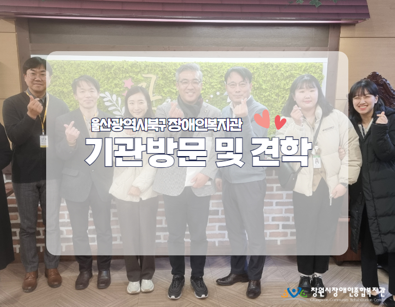 지난 1월 22일에는 복지관에 반가운분들이 다녀가셨습니다.울산광역시북구장애인복지관 박기석 관장님과 종사자 분들이 기관을 방문하여 창원시장애인종합복지관의 사업안내와기관소개 및 라운딩, 관련사업에 대해 질의응답 등의 시간을가졌습니다. 울산광역시북구장애인종합복지관은 2023년 10월 7일에 개관하여 울산 북구 지역사회 내 다양한 장애인복지서비스제공하고있는 기관입...