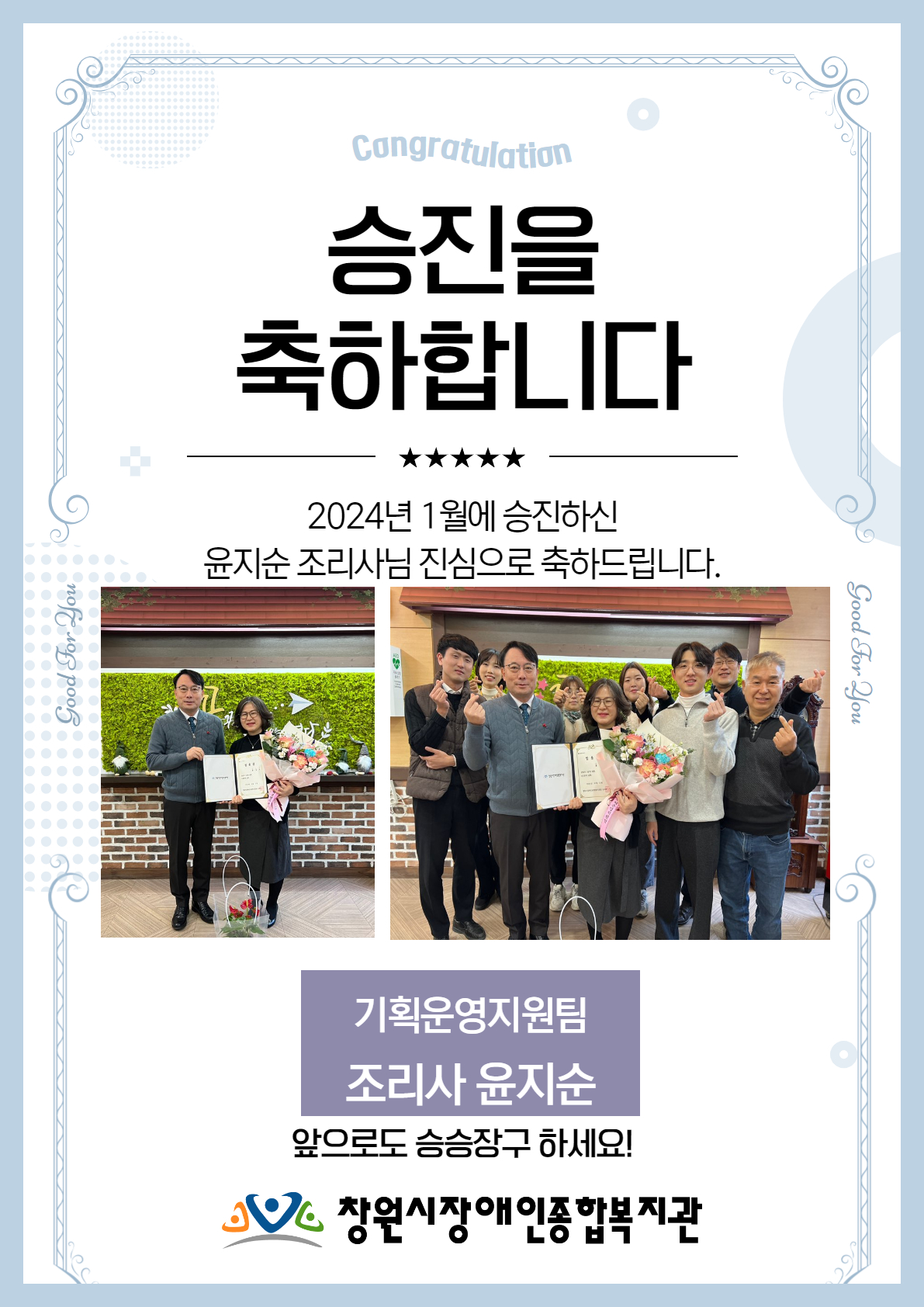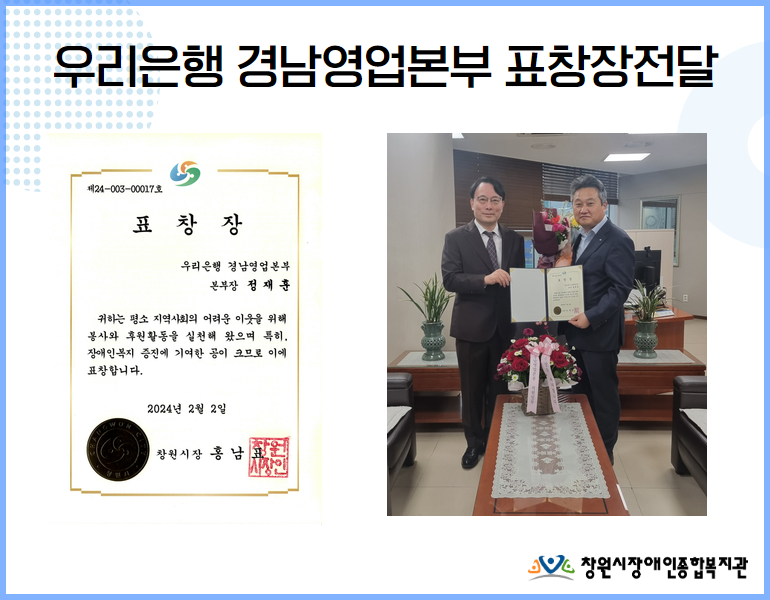 창원시장애인종합복지관(관장 송호도)에서는 우리은행 경남영업본부(본부장 정재훈)에창원시장 표창장을 전달하였습니다.우리은행은 지난 2013년 맺은 인연을 시작으로 복지관의 다양한 사업을 지원하며 후원금 전달과봉사활동을 통해 장애인복지 증진에 기여한 공적을 인정받아 창원시장(홍남표)님으로부터표창장을 수여받게 되었습니다.창원시장표창을 받은 우리은행 경남영업본부 정...