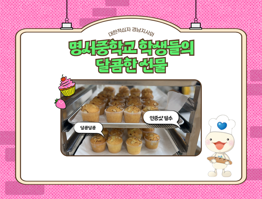 날씨가 꾸무리해 달콤한 디저트와 커피한잔이 나는데요~마침 복지관에서도 달달한 빵 구운냄새가 퍼졌답니다:)지난 주말 명서중학교학생들이 대한적십자경남지사에서 봉사활동을 하면 만든 머핀 90여개를 복지관에 후원해주었는데요주말임에도 장애인분들께 나눠드릴빵을 정성껏 만들어주었습니다^^명서중학교 친구들 이 후원해준 머핀은 장애인복지관 내의 아듬카페 이용자와 장애인가정...