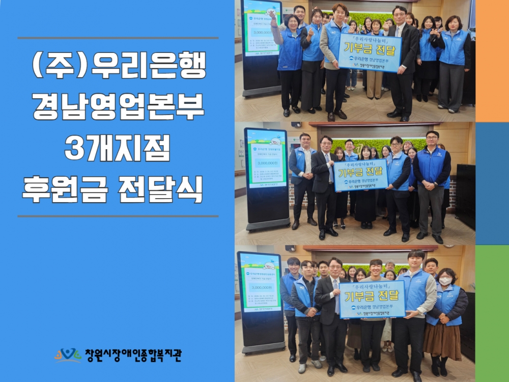 지난 25일, (주)우리은행 경남영업본부 3개지점 후원금 전달식을 진행했습니다.