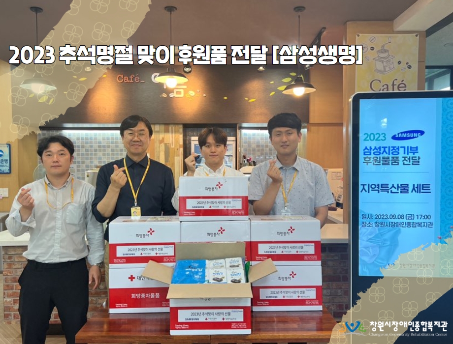 2023년 추석을 맞아 삼성에서 지정후원하고 대한적십자사에서 지원한희망풍차선물세트가 창원시장애인종합복지관에 도착하였습니다 :)장애인분들의 행복과 건강을 기원하며 풍요로운 명절이 되길바란다는마음까지 잘 전달하도록 하겠습니다.매번 잊지않고 소중한 물품을 보내주시는 삼성생명, 사랑의열매, 대한적십자사에다시한번 감사드립니다!*희망풍차물품은 김, 미역, 쌀, 잡곡등...