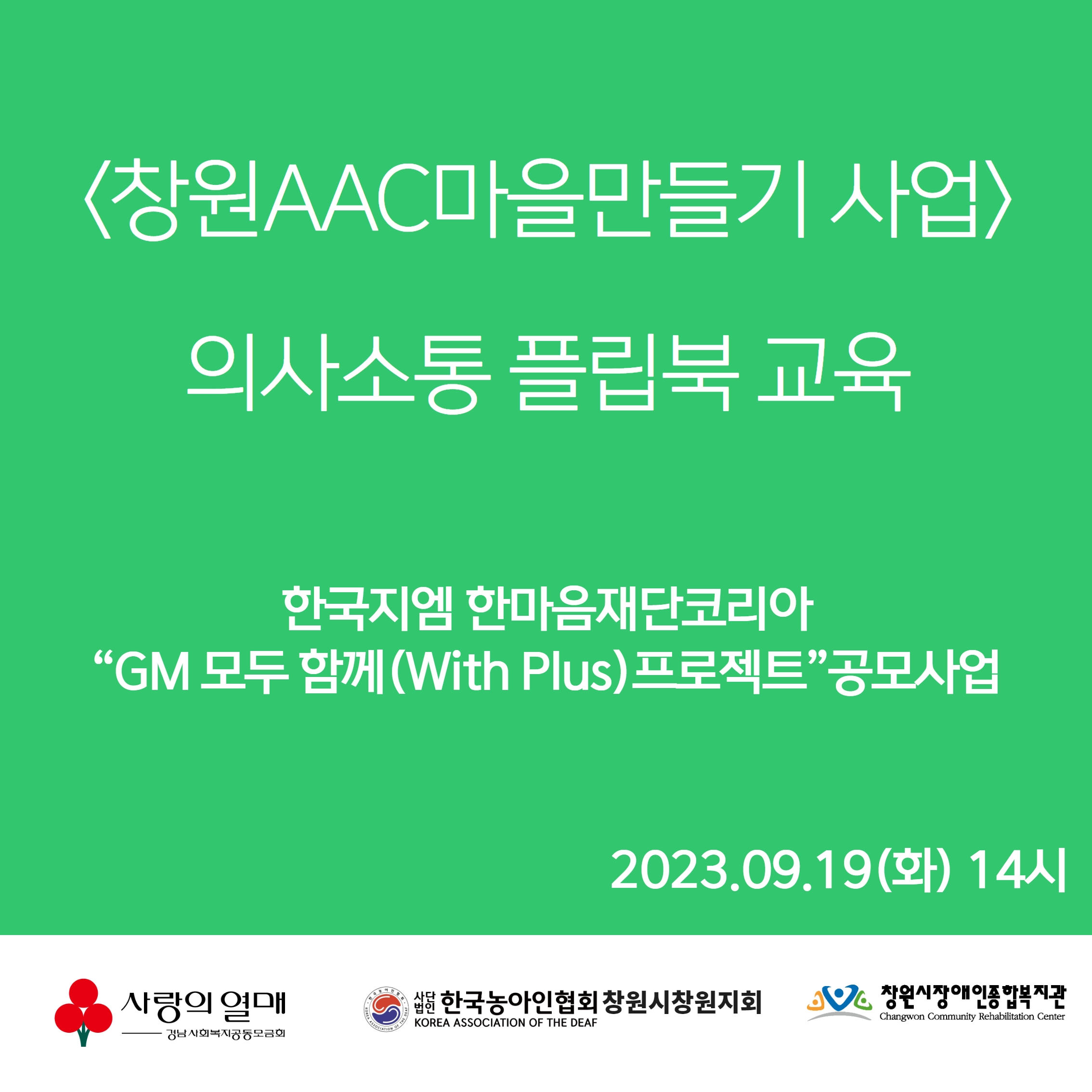 한국지엠 한마음재단코리아 “GM 모두 함께(With Plus)프로젝트”공모사업 <창원AAC마을만들기 사업> 선정되어 진행되고 있습니다.이번 사업을 통해 의사소통의 어려움을 겪고 있는 장애인 30명에게 의사소통 플립북을 전달하고 약국,편의점,사진관 등 90개 가게에 의사소통판을 지원할 계획입니다.의사소통의 어려움을 겪고 있는 장애인 중 한국농아인...