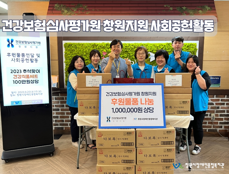 건강보험심사평가원 창원지원(배경숙 창원지원장)에서는 추석명절을 맞아 9월20일(수) 창원시장애인종합복지관을 방문하여 저소득 장애인가정을 위한 후원물품을 전달하였습니다. 이번 후원물품은 지난 여름 무더운날씨와 감염병등으로 인해 면역력이 약해진 장애인가정에 드릴 건강식품으로 구성된 선물세트 (100만원상당)를후원해주셨으며 직원분들과 함께 의미있는 봉사활동까지 ...