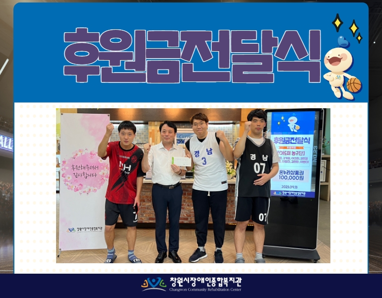 창원시장애인종합복지관의 의미있는 기부금 전달식이 있었습니다!그 주인공은 바로, 복지관의 아드미 농구팀의 "주태환, 강기원, 이건희, 김민겸, 장원녕, 안영진, 김민항, 이병대" 8인의 선수들로이번 대회에서 좋은성적을 거두며 받은 상금을 복지관의 저소득장애인을 위해 써달라며 기부를 해주었답니다 ^0^명절을 맞아 지역사회에서도 크고작은 소중한 마음을 받고있는 ...