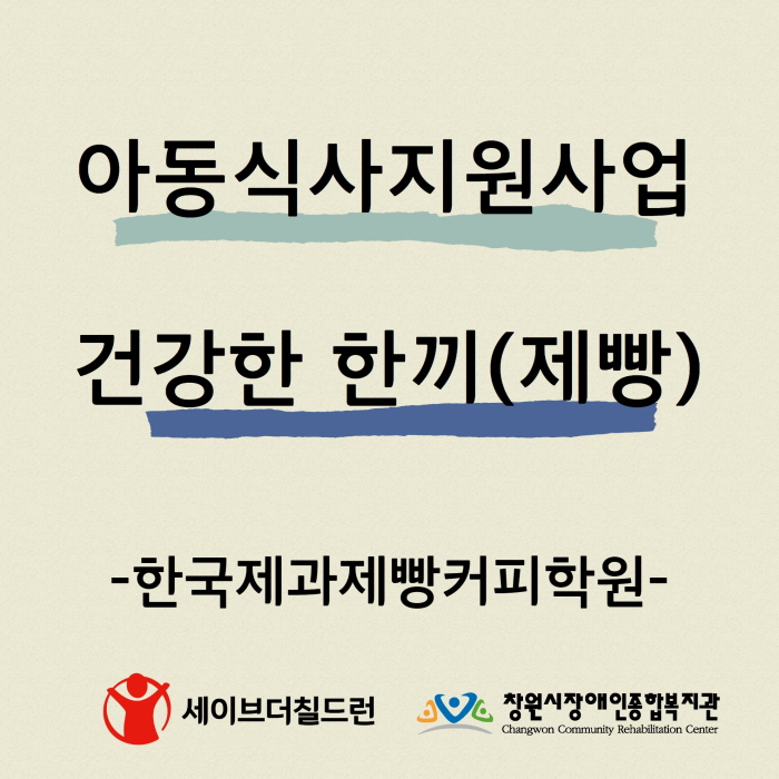 2023 세이브더칠드런과 함께진행하는 아동식사지원사업 중 건강한 한끼(제빵)프로그램을 진행하였습니다.한국제과제빵커피학원(한응섭 원장)과 협의를 통해 1차(7.14)/2차(8.26)로 나누어 제빵 수업을 진행하였습니다.제빵 수업을 통해 지원대상아동과 부모님이 함께하는 시간을 가질 수 있었고 쿠키와 빵도 맛볼 수 있는 좋은 시간이었습니다.