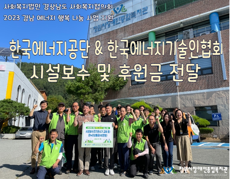 2023년 09월 10일 (일), 창원시장애인종합복지관에서 경상남도 사회복지협의회 지원 2023 경남 에너지 행복 나눔 사업의 일환으로 '한국에너지공단 경남본부'(본부장 배상석 외 3명) 및 '한국에너지기술인협회'(본부장 류장수 외 12명)의 직원 일동이 방문하였습니다. 관장님의 인사를 시작으로 협회 분들과 함께 시설 보수가 진행되는 위치를 공유하고 업...
