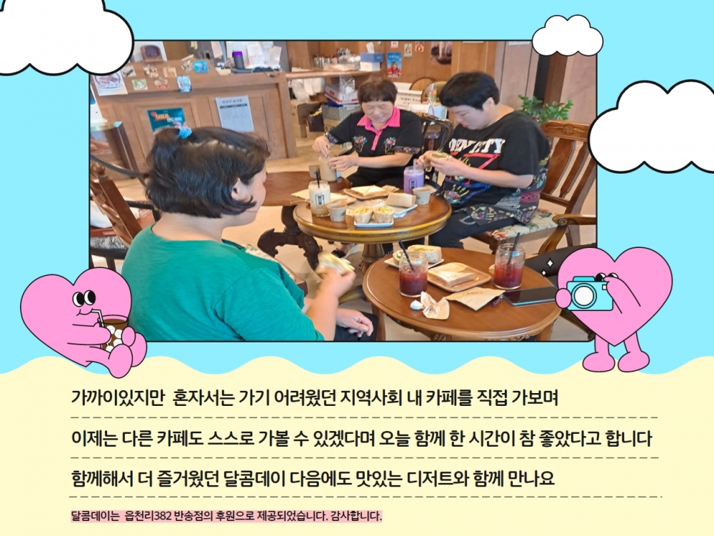 장애인 휴식지원 함께해서 즐거운 달콤데이 페이지 정보 작성자 신효진 댓글 0건 조회 2,321회 작성일 23-09-05 15:27 본문 장애인 휴식지원 함께해서 즐거운 달콤데이 이전글2023 세이브더칠드런 아동식사지원 사업 - 건강한한끼 제빵 수업 진행(1차/2차) 23.09.06 다음글장애가정 지원 협력사업 준비 간담회 실시 23.09.05 목록 댓글목록 댓글목록 등록된 댓글이 없습니다.