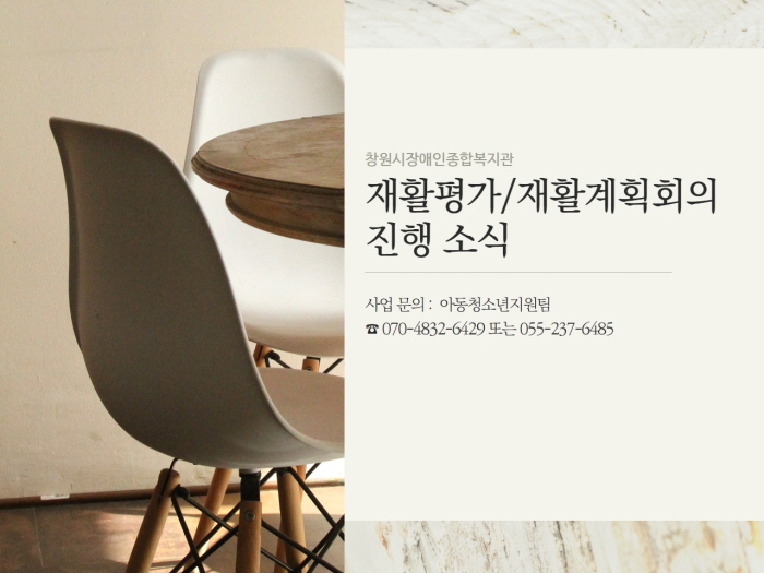 ○ 재활평가 및 재활계획회의 진행 소식 안내 - 일 시 : 매주 수요일 오전 - 참 여 : 아동, 보호자, 복지관 다 영역 전문가 - 내 용 : 재활평가(다 영역 직접 검사, 행동관찰평가), 재활계획회의(평가 결과 공유, 재활계획회의)- 신 청 : 전화 및 방문 신청(사전)- 문 의 : 아동청소년지원팀 055-237-6485 또는 070-4832-...