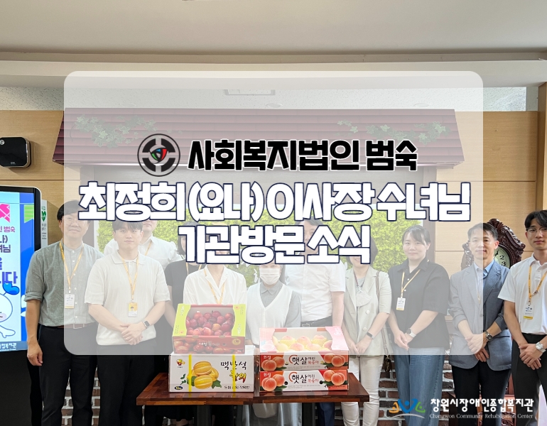 지난 7월5일(수), 사회복지법인 범숙의 최정희(요나)이사장 수녀님께서 창원시장애인종합복지관을 방문해주셨습니다.이번방문에는 이용자와 직원을 위한 푸짐한 제철과일까지 준비해오셔서 더 맛있게 함께 나눌수있었습니다: )복지관 전체를 둘러보시며 사업과 시설운영 등에 대해서도 많은 격려와 조언 또한 아낌없이 나눠주셨습니다.앞으로도 창원시장애인종합복지관은 법인의 핵심...