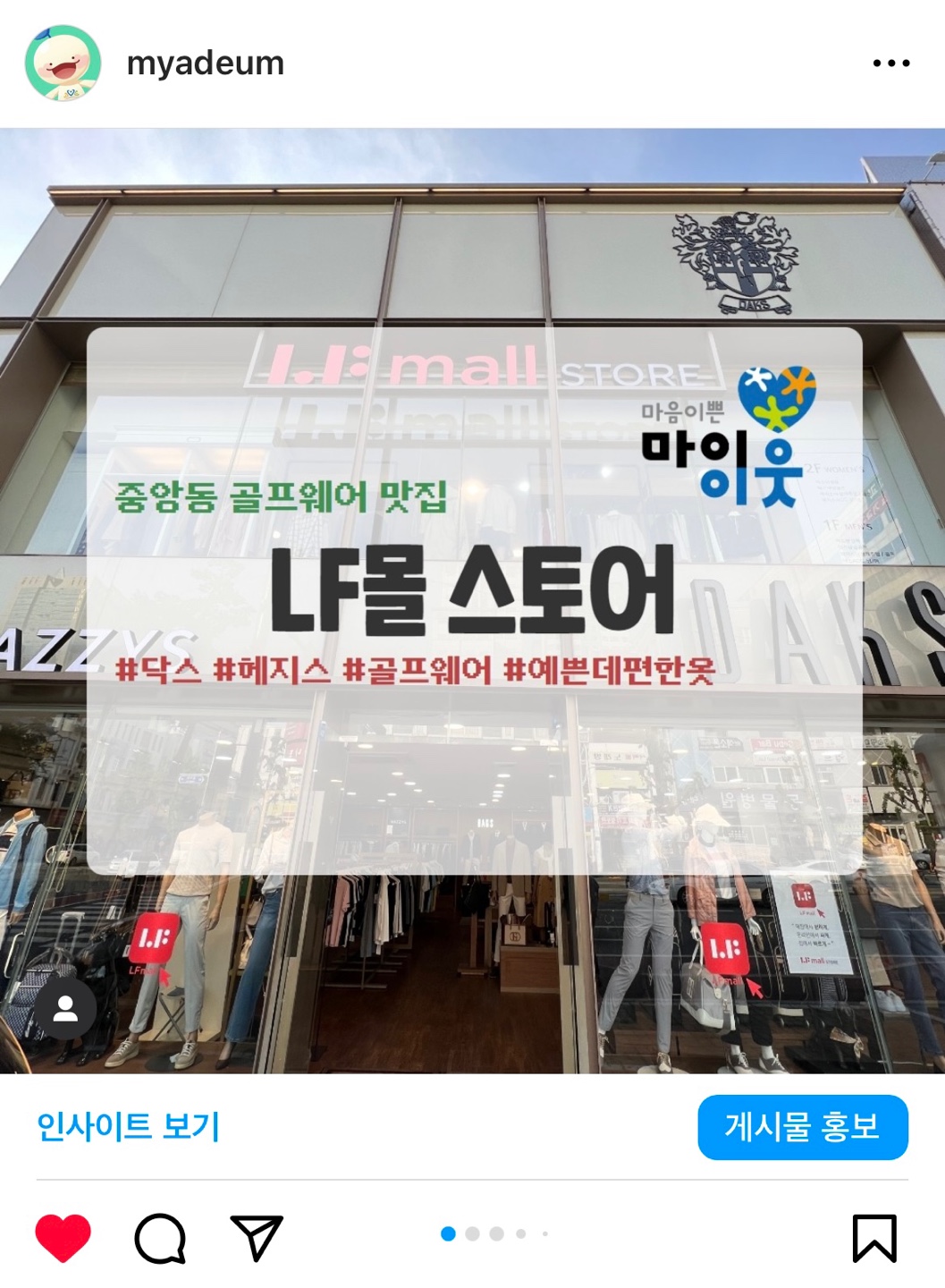 마이이웃을 소개합니다! 복지관의 60번째 마음이 이쁜 이웃이 되어주신 LF몰(닥스,헤지스) 창원 중앙점 입니다!이곳은 백화점보다 저렴하고 아울렛보다 품질 좋은 닥스, 헤지스 상품을 구입할 수 있는 곳으로 유명하답니다 :) 창원중앙동에 위치한 LF몰은 이쁘고 고급스럽기로 유명한 닥스, 헤지스 통합매장으로 다른매장에 비해 큰 규모를 자랑하는데요!1층 2층까지...
