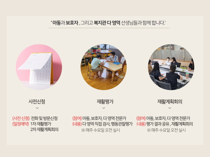 - 내 용 : 재활평가(다 영역 직접 검사, 행동관찰평가), 재활계획회의(평가 결과 공유, 재활계획회의)