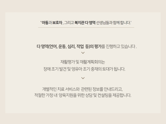 개별적인 치료 서비스와 관련된 정보를 안내 드리고, 적절한 가정 내 양육지원을 위한 상담 및 컨설팅을 제공합니다.