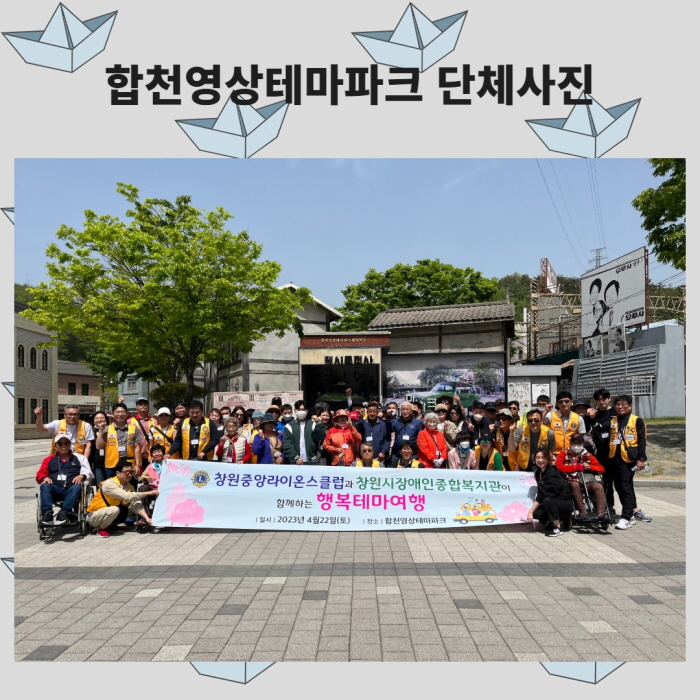 2023년 04월 22일(토)제43회 장애인의날을 맞이하여 창원중앙라이온스와 함께하는 행복한 테마여행을 기획하였습니다.장소는 경남 합천!장애인들과 라이온스 회원 총60명이 참석하여 버스 2대로 이동하였습니다.합천물문화관을 방문하고 식사를 한 후 합천영상테마파크에서 장애인과 라이온스회원이 1:1로 조를 구성하여 즐거운 시간을 보냈습니다.함께 여행을 다녀온 이...