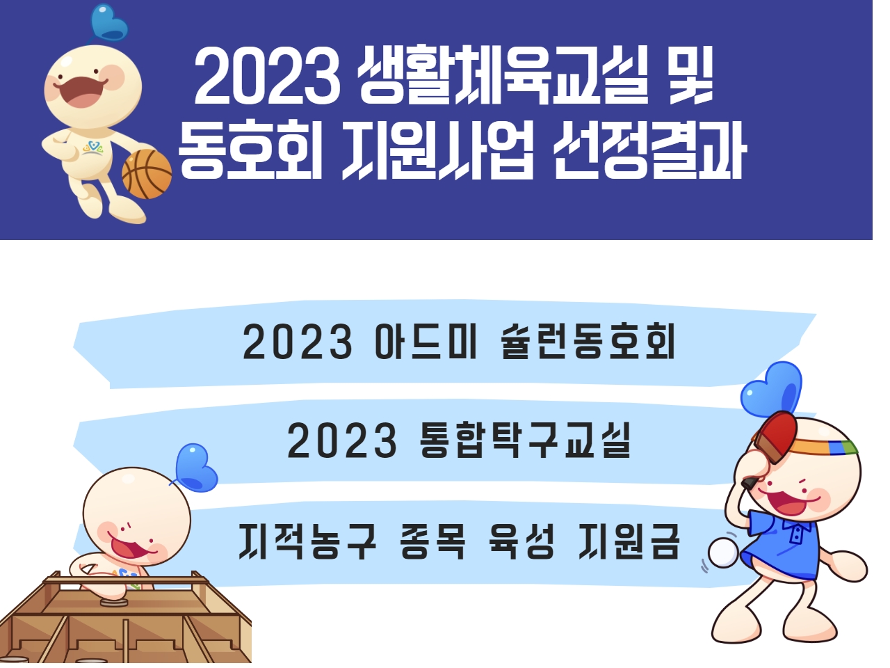 2023년 경상남도 및 창원시 생활체육교실 및 동호회 지원사업 선정 결과입니다. 올해는 아드미슐런동호회와 통합탁구교실이 선정되었습니다. 아울러 22년 전국체전 첫승의 쾌거로 단체종목 육성 지원금까지 받게되었습니다. 즐겁고 안전하게 프로그램에 참여할 수 있도록 환경을 잘 마련하겠습니다. 감사합니다.