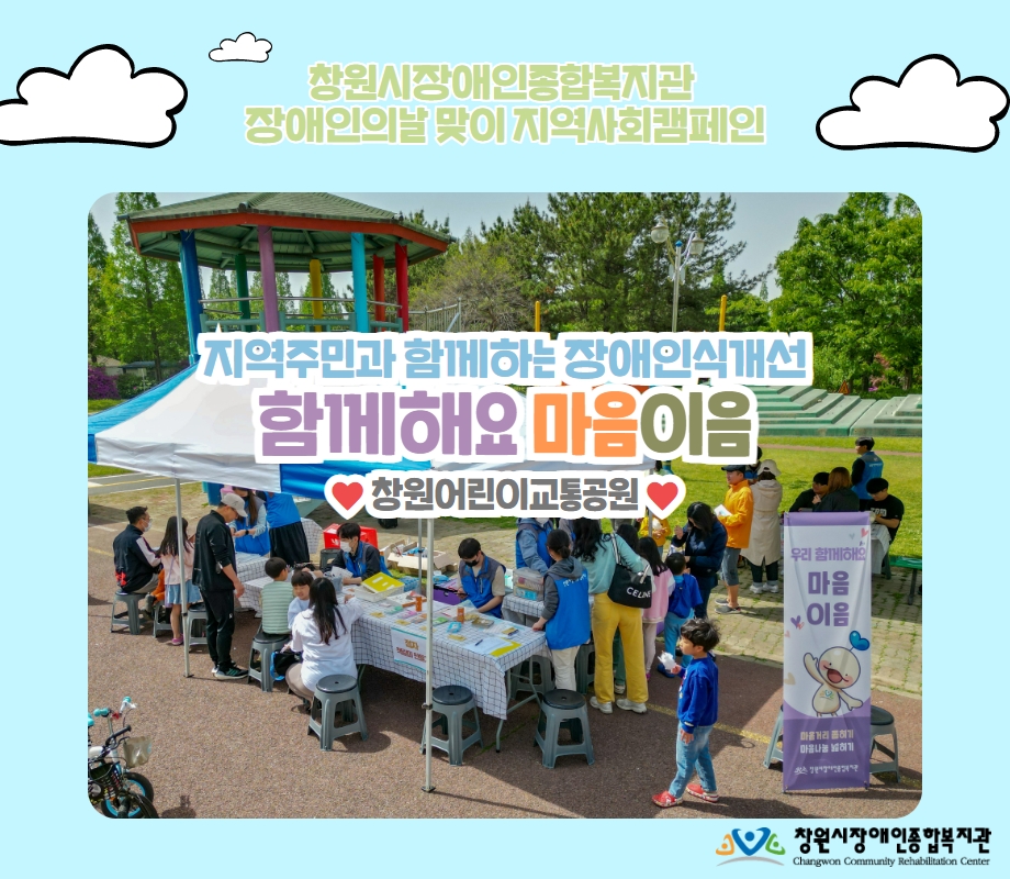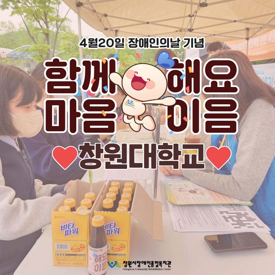 창원시장애인종합복지관에서는 4월20일 장애인의 날을 맞아 다양한 행사들을 진행했는데요,그 중 지역주민과 함께하는 장애체험, 인식개선, 캠페인 등의 활동을 2번에 나눠 실시했습니다.먼저 4월 19일 수요일! 우리복지관과 인연이 깊은 창원대학교 정문에서 행사를 진행하였습니다. 시험기간임에도 많은 학생들이 직접 체험활동에 참여해주며 장애인의 날 의미를 되새길수있...