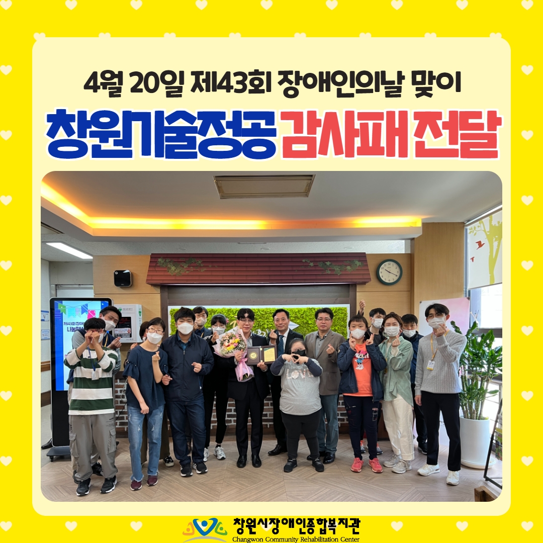 늘 복지관의 크고 작은일이 있을때마다 가장 먼저 손길을 내밀어주시는 창원기술정공의 감사패 수여식이 있었습니다.이번 제43회 장애인의 날을 맞아 사회공헌활동으로 장애인복지증진과 권익향상을 위해 힘써주신"창원기술정공 해외영업팀 오재근 차장"님께 감사패를 전달하였는데요,많은분들이 장애인의 날에 관심을 갖고, 장애인당사자분들의 재활의욕도 고취할 수 있도록 의미있는...