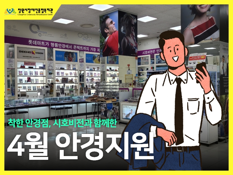4월 26일(수) 오후 2시우리 동네 착한 안경점, 시호비전 롯데마트 창원점에서 4월 안경지원이 진행되었습니다.장애 유형별로 의사소통과 시력검사 시 착석까지 여러가지 과정이 더 추가되었음에도 불구하고시력검사부터 안경 테 고르기, 최종적으로 안경을 맞추고 난 후 몸에 맞도록 편리하게 해 주는 작업까지친절하게 도와주신 시호비전 롯데마트 창원점 사장님께 다시 한...
