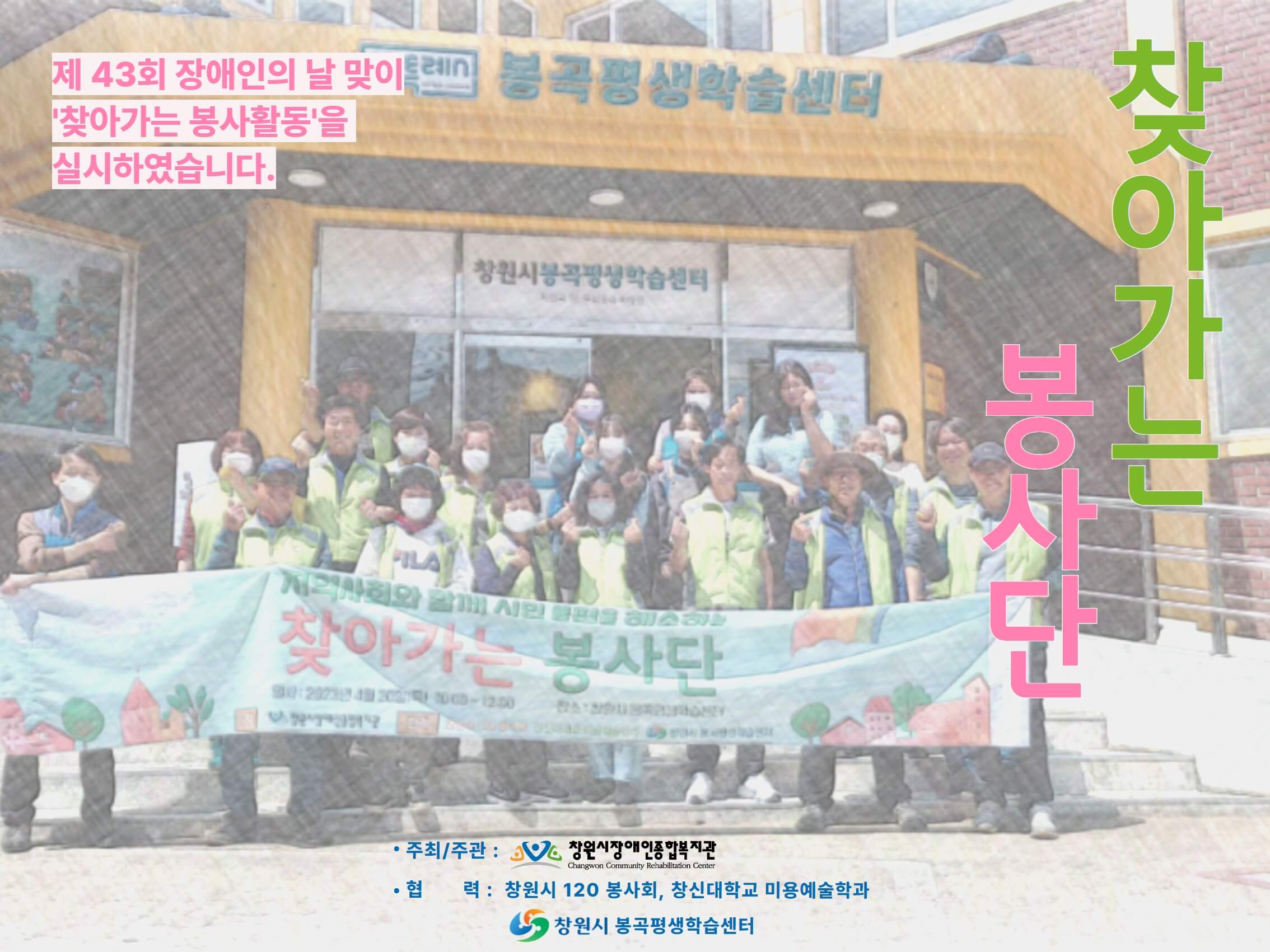2023년 4월 20일 목요일, 제43회 장애인의 날을 맞이하여'120 봉사회'와 함께하는 봉사활동을 실시하였습니다.이번 활동은 복지관에서 벗어나, 지역주민분들의 터전에서 봉사활동을 하자는 취지로'찾아가는 봉사단'으로 테마를 잡아, '창원시 봉곡평생학습센터'에서 진행하였습니다.'120 봉사대' 뿐 아니라, 개인봉사자와 창신대 미용예술학과의 협조를 더해'칼 ...