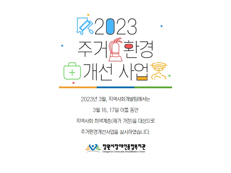우리 복지관에서는 지난 3월 16일, 17일 이틀 동안 지역사회 취약계층 (재가 가정)을 대상으로 쾌적한 생활환경 조성과 화재로 인한 생명 및 재산 보호를 위한 '주거환경개선사업'을 실시하였습니다.16일(목) 봉림동 드림하우스 봉사단과 함께 재가 가정의 도배 및 정리정돈을 실시하였습니다. 17일 (금) 경남자원봉사센터와 연계, (주)세아창원특수강 사회봉사단...