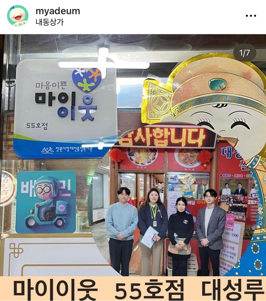 나눔으로 실천하는 마음이 이쁜 이웃, 마이이웃 55호점 대성루를 소개합니다! :)창원 최초주상복합(?)내동상가 뒷편 공단상가 지하에 위차한 대성루는 주변지역 공단직원들께 특히 사랑받고있는중국음식점인데요, 창원시장애인종합복지관의 소중한 이웃으로 동참해주셨습니다! 내부공간은 매우 넓은편이라 단체예약도 거뜬!룸공간도 있어 프라이빗하게 식사도 가능한 곳 이랍니다 ...
